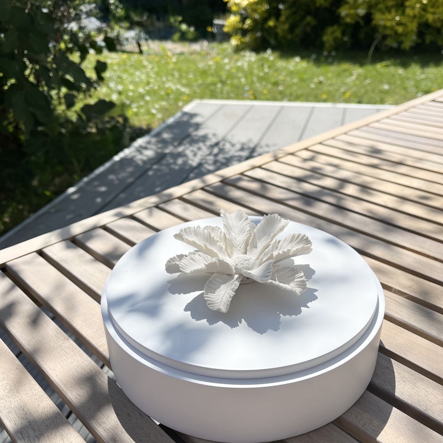 MANG is a decorative box made entirely of white acacia wood with a lacquered finish and a white porcelain flower on the lid. It measures 15 x 15 x 9 cm and is signed ANOQ.