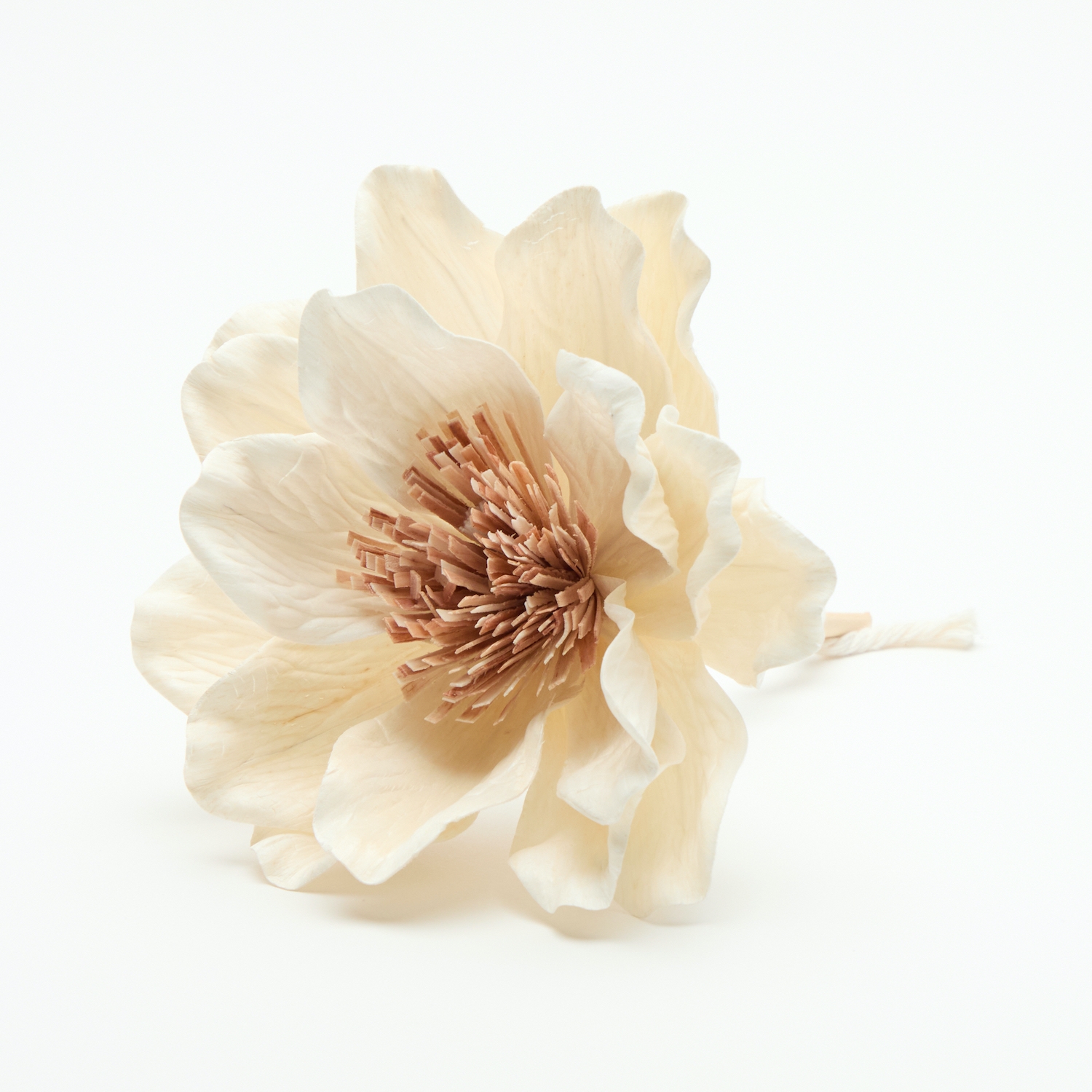 Sublime fleur de Sola en forme de gardenia (18 cm), aux pétales blanc cassé et cœur marron, montée sur tige bois avec cordon coton pour diffusion de parfum.