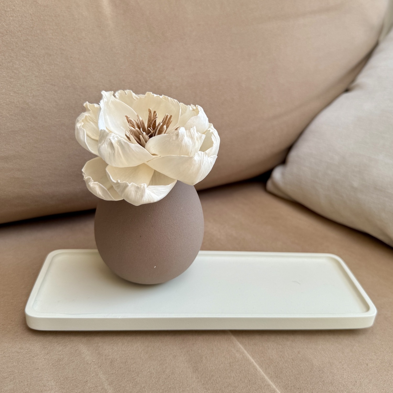 Sur le plateau, un vase en forme d’œuf en céramique marron chocolat accueille une fleur de sola qui diffuse délicatement les effluves de votre choix.